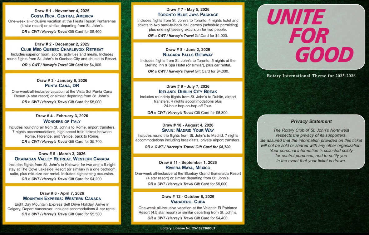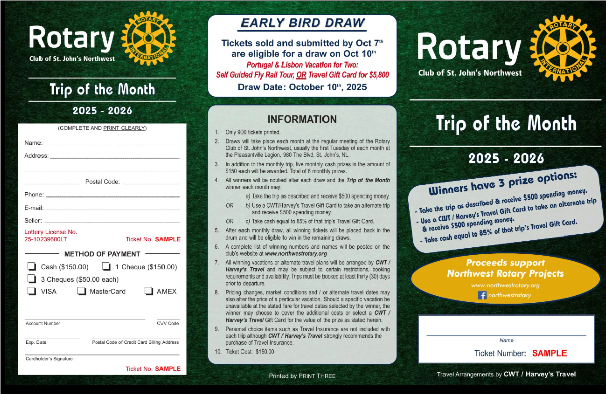 Beginning in November, at our regular meeting on the first Tuesday, a winner for that month's trip is drawn. All 12 trips (and their values) are described on your membership card, so you'll know exactly what trips you can dream about. All trips include return airfare for two people, accommodations, and a spending allowance of $500. Some trips even include tickets to the theatre or some other special activity at the destination. Each winner has the choice of taking the trip as awarded (valid for one year), OR taking an alternative trip of his/her choice of equal or lesser value, OR taking cash equal to 85% of the trip won. Each month's draw also has five runners-up, each one winning $150.